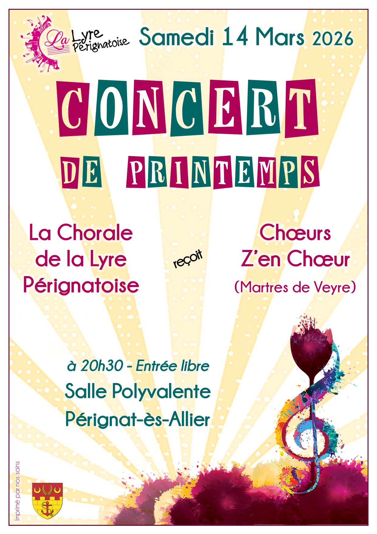 La Chorale de la Lyre Pérignatoise vous propose son traditionnel concert de Printemps le Samedi 14 Mars à 20h30 à la Salle Polyvalente de Pérignat.