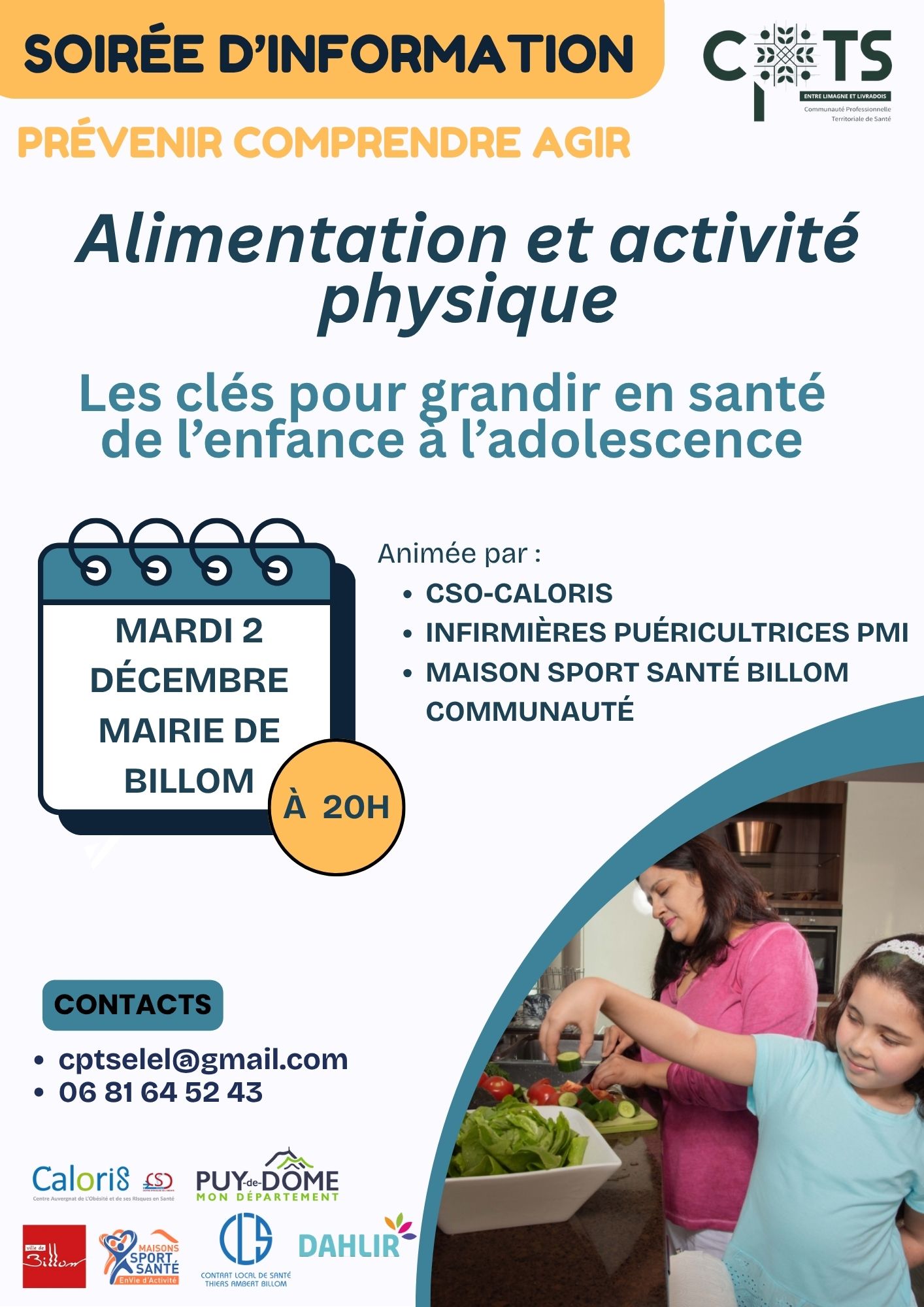La CPTS Entre Limagne et Livradois vous donne rendez-vous le mardi 2 décembre à 20h à la Mairie de Billom pour une soirée grand public d’informations et d’échanges autour de l'alimentation et de l'activit& physique : "Les clés pour grandir en santé de l'enfance à l'adolescence".